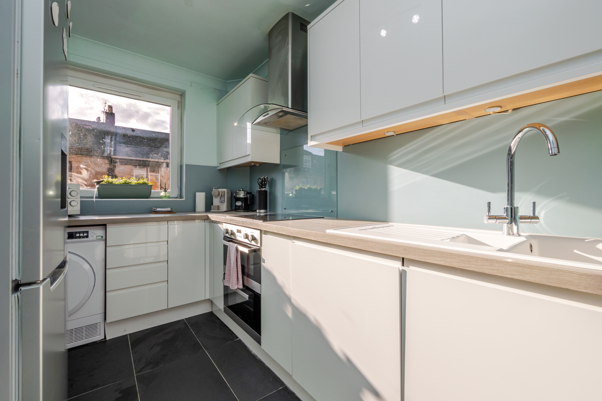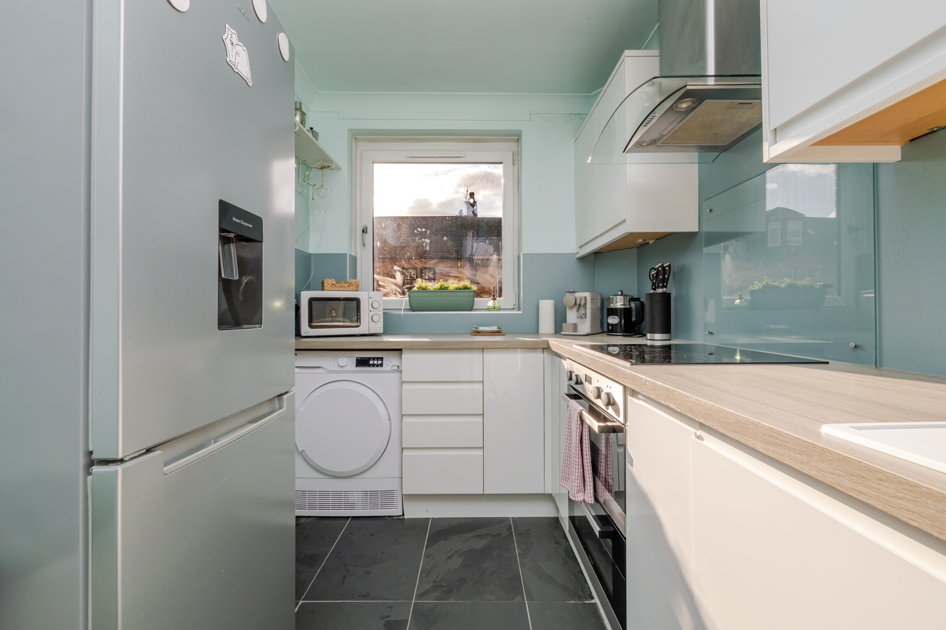 The accommodation comprises a bright and welcoming hallway leading to a spacious lounge with dining area. The modern fitted kitchen is finished to a high standard and includes an integrated electric oven and hob. There is also a tumble dryer, fridge freezer, washing machine, and dishwasher.